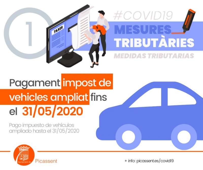 Con motivo de la crisis generada por el Covid19, el Ayuntamiento de Picassent ha ampliado el plazo de pago de sus tributos con el objetivo de facilitar con su cumplimiento por parte de los contribuyentes, asà las personas que tengan que pagar el impuesto de vehÃculos y no tengan domiciliado el recibo en el banco, pueden hacerlo hasta el próximo 31 de mayo, en lugar de hasta principios de abril como es habitual.