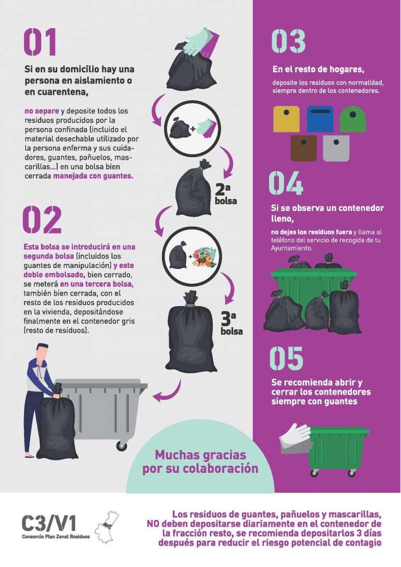 Esta bolsa se introducirá en una segunda bolsa (incluidos los guantes de manipulación) y este doble embolsado, bien cerrado, se meterá en una tercera bolsa, también bien cerrada, con el resto de los residuos producidos en la vivienda, depositándose finalmente en el contenedor gris (resto de residuos).
