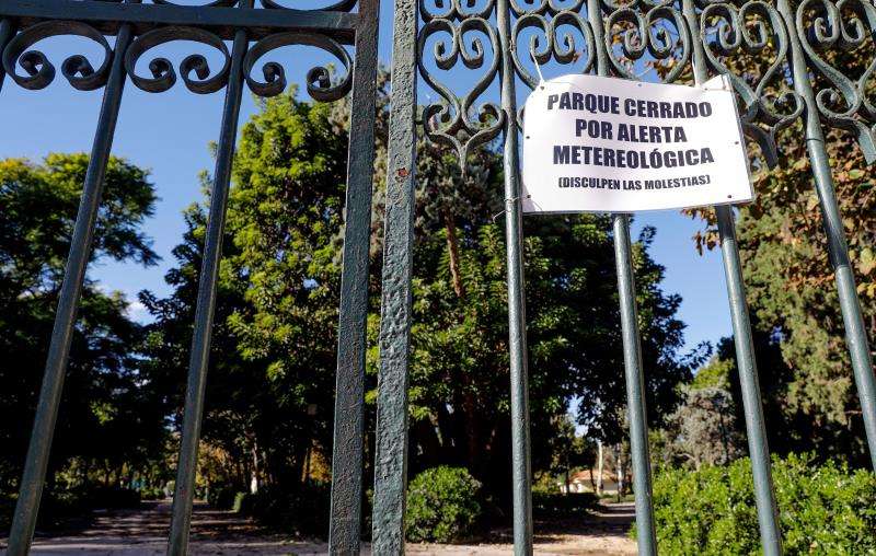 En la ciudad de València, el Ayuntamiento ha decidido cerrar al público los parques y jardines con valla alrededor, como los de Viveros o los de Monforte, por la alerta de fuerte viento.
