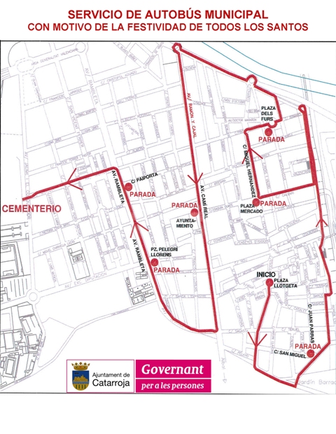 Asimismo, el Ayuntamiento habilita un servicio especial de transporte, que partirá desde la Plaza de la Llotgeta cada hora hasta el cementario. Este autobús dará servicio desde el jueves, 30 de octubre hasta el 1 de noviembre, de 9 a 13 horas y de 16 a 18 horas, realizando las siguientes paradas: Pl. Llotgeta, calle Juan Parras con San Miguel, Pl. Mercat con Miguel Hernández, Pl. dels Furs, Camà Reial frente al Ayuntamiento, Av. Rambleta con Pelegrà Llorens, Av. Rambleta con Málaga y cementerio.