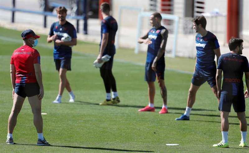 El entrenador del Levante, Paco López (i), durante el entrenamiento de la Fase 3 tras el confinamiento realizado este miércoles en la ciudad deportiva de Buñol. EFE-Kai Försterling El entrenador del Levante, Paco López, ha dividido a la plantilla en tres grupos para trabajar durante la fase tres de entrenamientos de tal manera que con cada equipo puede hacer prácticamente un once titular.