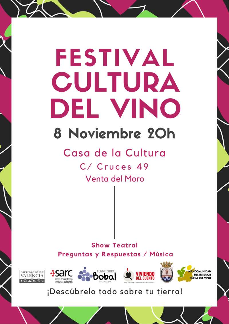 La organización del Festival de la Cultura del Vino ha informado del cambio en la fecha en la que llegará a Venta del Moro que pasa a ser el dÃa 8 de noviembre a las 20:00 h. El lugar será el mismo que el elegido originalmente: la Casa de la Cultura (C/Cruces 49).