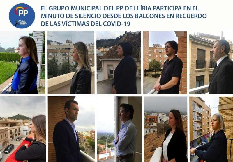 El grupo municipal del PP de Llíria participa desde los balcones en el minuto de silencio en recuerdo de las víctimas del COVID-19.