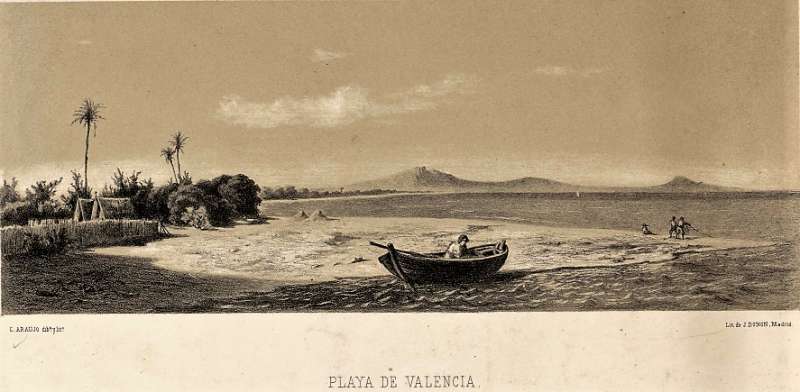 El testimonio gráfico lo aporta el polifacético crítico y artista santanderino Ceferino Araujo Sánchez (1824-1897) con la litografía titulada "Playa de Valencia" que presentó a la Exposición Nacional de 1862, actualmente depositada en la Sala Goya del Museo de la Biblioteca Nacional.