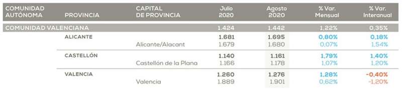 Respecto a las capitales valencianas, todas crecieron mensualmente, siendo Castellón de la Plana (1,07%) la que más lo hizo de la región. Las capitales de Alicante (1,54%) y Castellón de la Plana (1,20%) arrojaron subidas intermedias frente al año pasado, y Valencia (-1,20%) se ajustó de forma contenida. Con 1.178 euros por metro cuadrado en agosto de 2020, Castellón de la Plana fue la décima capital de provincia más asequible de España. Alicante (1.680 €/m²) y Valencia (1.901 €/m²) fueron algo más caras.