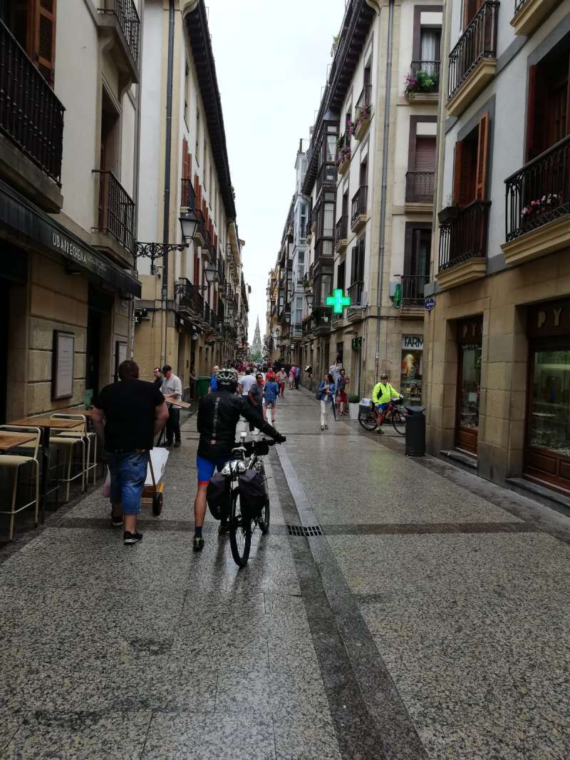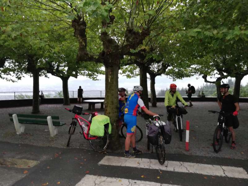 Iniciamos el camino a primera hora amaneciendo en el puente de Santiago sobre el estuario del rÃo Bidasoa, cerca de su desembocadura entre Hendaya y Hondarribia. Con anterioridad habÃamos sellado nuestra credencial. Pronto pasamos por el Ayuntamiento, por la Plaza del Ensanche y en breve nos enfrentamos con la subida al Monte Jaizkibel en Hondarribia, pasamos por la Ermita de Santiagotxo. La subida al Jaizkibel requiere que nos bajemos de la bicicleta en algunos tramos por el fuerte desnivel que presenta. Dos kilómetros después aparece ante nuestra vista el Ermita de la Virgen de Guadalupe en el monte Jaizkibel , patrona de Hondarribia. En la Ermita hay objetos marinos donados por pescadores. Desde este lugar disfrutamos de maravillosas vistas de la bahÃa de Txingude. Continuamos subiendo por repechos más o menos asequibles y continuamos unos 10 kilómetros hasta la próxima población Pasajes de San Juan (Pasai Donibane), vistas espectaculares desde lo alto del monte. Aquà tomamos un barco para atravesar hasta Pasajes de San Pedro (Pasai de San Pedro), a nuestro paso vamos visitando las calles de la localidad. Una vez en Pasajes de San Pedro continuamos nuestro camino y llegamos a la Playa de Zurriola en San Sebastián y desde allà contemplamos el monte Urgullu que se encuentra en uno de los extremos de la bahÃa de la Concha en la parte vieja, donde se encuentra el Castillo de la Mota. Cruzamos el Puente de Kursaal, precioso y con bonitas vistas. Bordeamos el monte Urgullu y vamos descubriendo el monte Igueldo y la espectacular playa de la Concha.