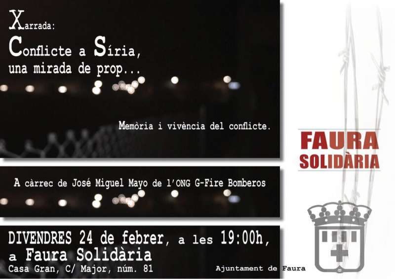 Amb el tÃtol "Conflicte a SÃria: una mirada de prop. Memòria i vivència del conflicte", José Miguel Mayo, de l'ONG G-Fire Bomberos, oferirà una xarrada sobre el drama dels refugiats d'aquest paÃs de l'Orient Pròxim. Serà el pròxim divendres, 24 de febrer, a les 19 hores, a la seu de Faura Solidà ria (Casa Gran. Carrer Major, número 81).