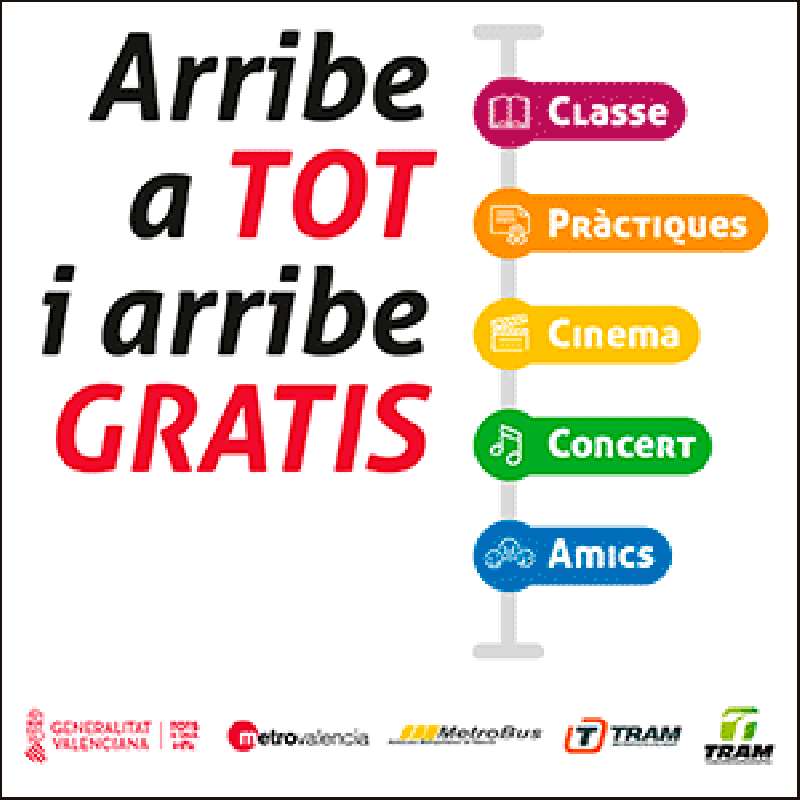 La Generalitat ofrece servicio gratuito en los transportes de su competencia a los jóvenes de hasta 30 años, desde el 9 de octubre y hasta el 15 de enero de 2023 .Esta tarjeta se puede utilizar en los servicios de transporte de Metrovalencia, TRAM d'Alacant, TRAM de Castelló, Metrobús y EMT.