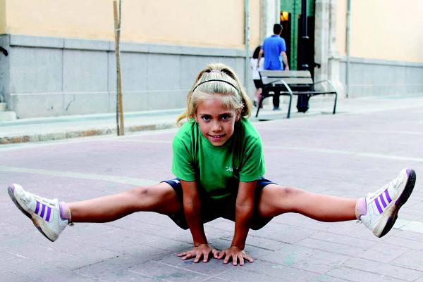Durante esta entrevista, Paula no se opone a mostrar algunas de las posiciones del deporte que practica: la uve, la plancha, la carpa, ilusión… "Parece de goma, a veces crees que no podrá estirarse tanto, pero lo hace tan tranquila", comenta la madre. No tiene vergüenza, ni en Moncada ni cuando sale a la tarima. "No pienso en que haya gente ni nada. Salgo y hago los pasos y no pienso en nada más", revela Paula como secreto de su profesional actitud frente al público a pesar de su corta edad.