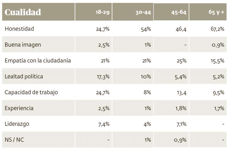 Por edades también hay respuestas muy diferentes y llamativas. Así, los mayores de 65 años son los que más valoran la honestidad, con un 67'2%, seguida por la empatía con la ciudadanía (15'5%) y la capacidad de trabajo (9'5%). La franja de 45 a 64 años también elige la honestidad con primer valor, pero la empatía con la ciudadanía se alza potente en segundo lugar on un 25%, seguida de la capacidad de trabajo (13'4). A continuación, las personas de 30 a 44 años optan por la honestidad (54%), la empatía (21) y la lealtad política (10%) y en es el caso de los más jóvenes, de 18 a 29 años, donde hay mayor división de las preferencias, con un 24'7% que han elegido la honestidad y la capacidad de trabajo, seguidos por la empatía (21) y la lealtad política (17'4).