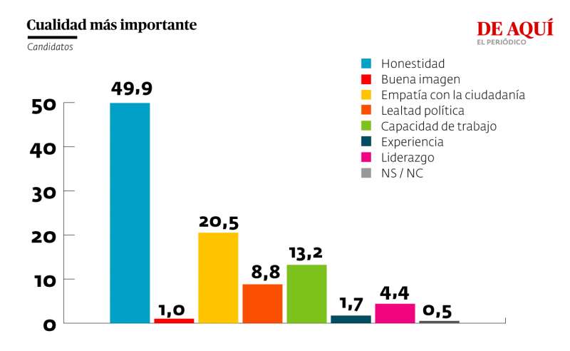 Con la que ha caído y sigue cayendo sobre corrupción en la ciudad de Valencia -con el número dos de Rita Barberá (PP) y el ex número 1 del PSOE (Rafa Rubio) en la cárcel-, los ciudadanos valoran especialmente la cualidad de la honestidad entre sus representantes políticos. Así se desprende de la encuesta de SyM Consulting para El Periódico DE AQUÍ, realizada los días 2 y 3 de junio, según la cual un 49'9% de los encuestados han elegido la opción de la honestidad como la principal cualidad; seguida de la empatía con la ciudadanía (20'5), capacidad de trabajo (13'2), lealtad política (8'8), liderazgo (4'4), experiencia (1'7) y buena imagen (1%).