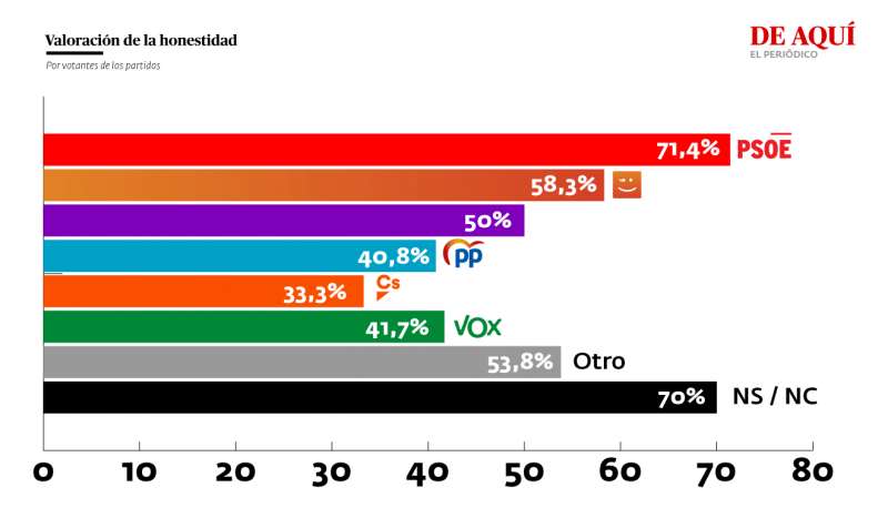 La valoración de la honestidad como principal cualidad también varía según el partido al que ha votado en 2019 cada encuestado. Los votantes de partidos de centro izquierda son los que más valoran la honestidad y los del centro derecha, los que menos. Así, los que han señalado que lo hicieron por el PSOE de Sandra Gómez, el 71'4% ha elegido este concepto. Los votantes de Compromís ocupan el segundo lugar con el 58'3%, mientras que los que han señalado que votaron a Podemos/EU, el porcentaje es del 50%. En el otro lado ideológico, los votantes de Vox eligen la honestidad con un 41'7%; los del PP, con un 40'8% y los de Ciudadanos, con un 33'3%.