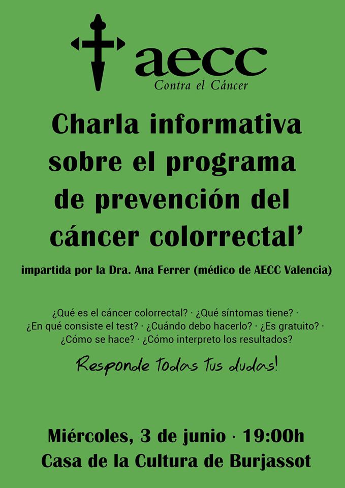 En este caso, la entidad burjassotense quiere que los vecinos del municipio estén informados de primera mano sobre la prevención del cáncer colorrectal, cómo hacerse el test que puede detectar de manera previa la enfermedad, quién debe hacérselo, cómo interpretar los resultados…en definitiva, todo lo que tiene que ver con la prevención de este tipo de cáncer.