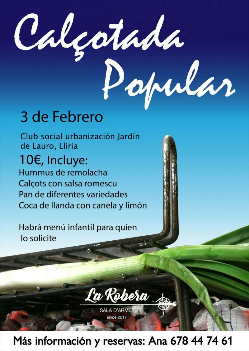El sábado 3 de febrero, La Robera Sala d'Armes organiza su primera calçotada popular para recaudar fondos para el club. Será en el Club Social de la urbanización Jardín de Lauro, en Lliria. En un bar con mucho espacio exterior en el que los niños pueden jugar y donde también se pueden pedir bebidas y ricas tapas caseras a precios populares.