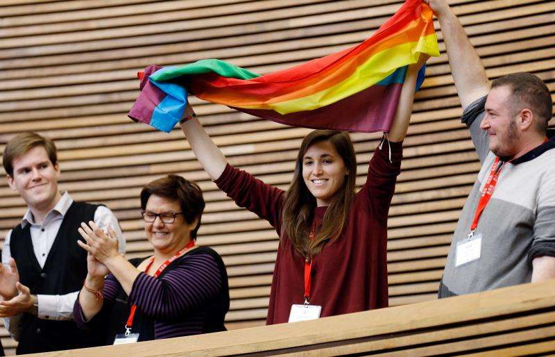 Tras la aprobación de la ley, medio centenar de miembros del colectivo LGTBI han posado para los medios gráficos junto a varios diputados tras una gran bandera arcoÃris para mostrar su satisfacción por este hito.