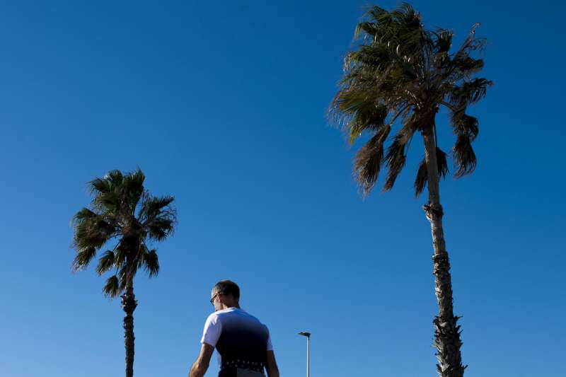 Una persona pasea bajo las palmeras mecidas por el viento. EFE-Andreu Esteban-Archivo