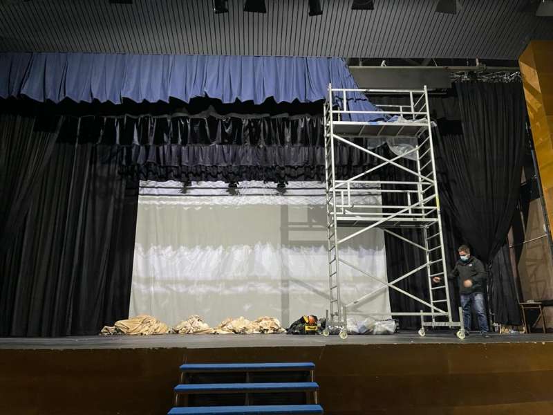 en el teatro, en la cámara negra, se están instalando patas, telones y