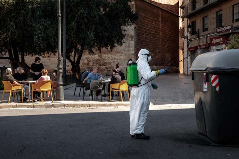 Un operario desinfecta unos contenedores en València. -- EFE.El presidente del Gobierno, Pedro Sánchez, ha aplaudido este sábado la