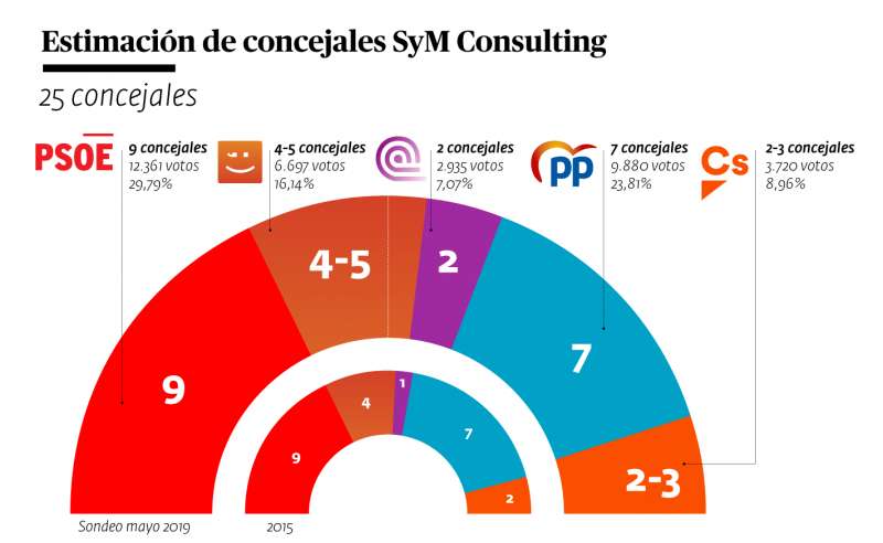 El PP bajaría de 9 a 7 concejales pero sería la fuerza hegemónica en el centro derecha con Ciudadanos mejorando hasta 2-3 ediles y el pinchazo de Vox (0)