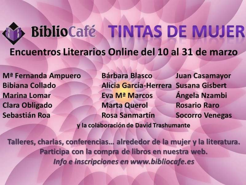 En ellos se contarán talleres de escritura, charlas, mesas redondas, recitales... en los que se podrá disfrutar de la fuerza de la literatura y las mujeres. Todos los encuentros se celebrarán por Zoom entre el 10 y el 31 de marzo y para participar solo que hay que comprar el libro de cada autora protagonista de la actividad en la web de BiblioCafé (envíos a toda España).