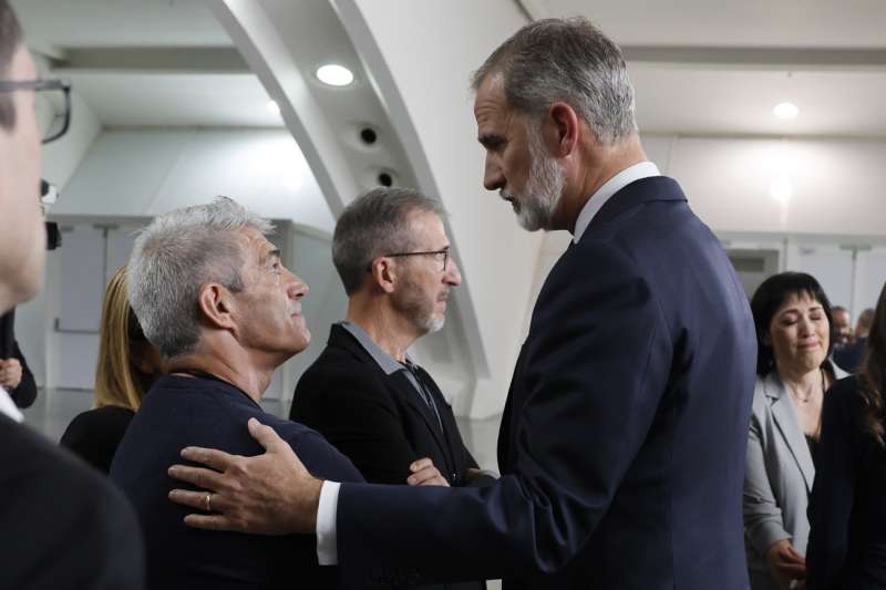 El rey Felipe VI (c) conversa con familiares de las víctimas a su llegada al funeral de Estado por las 237 víctimas de la dana celebrado este miércoles en Valencia con motivo del primer aniversario de la tragedia. EFE- Ballesteros POOL