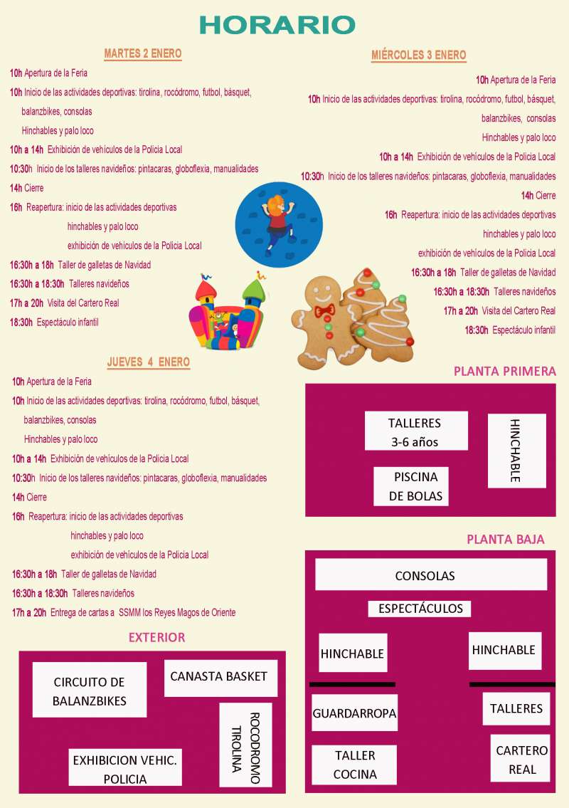 Se trata de un evento dirigido a los niños que contará con una amplia, variada y diversa oferta de ocio y diversión. Rocódromo, tirolina, hinchables, circuito de balanzbikes, futbolín, el palo loco, talleres de galletas navideñas, manualidades, pintacaras, etc, son algunas de las actividades que los niños podrán realizar durante los tres días de duración de la Feria. Asimismo los niños también podrán disfrutar de espectáculos infantiles, de la exposición de vehículos de la policía local y de la visita de los pajes de Sus Majestades de Oriente, a quiénes podrán entregar sus cartas. También el Ayuntamiento ha apostado por los jóvenes disponiendo una zona de consolas y wiis.