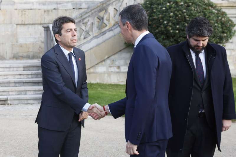El presidente del Gobierno, Pedro Sánchez (c), saluda al president de la Generalitat, Carlos Mazón (i), a su llegada a la Conferencia de Presidentes, este viernes. EFE/Javier Etxezarreta