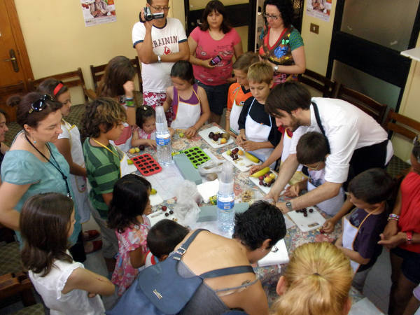 Al taller dirigido por el chef Guillermo Cerdá (La Sucursal, Torrijos, Taller gastronómico para las Añadas de España, etc.) asistieron 18 niños de todas las edades que junto con sus padres, abuelos o hermanos mayores disfrutaron del placer de hacer unos bombones de chocolate con frutas o verduras mientras aprendieron sobre buenos hábitos alimenticios.