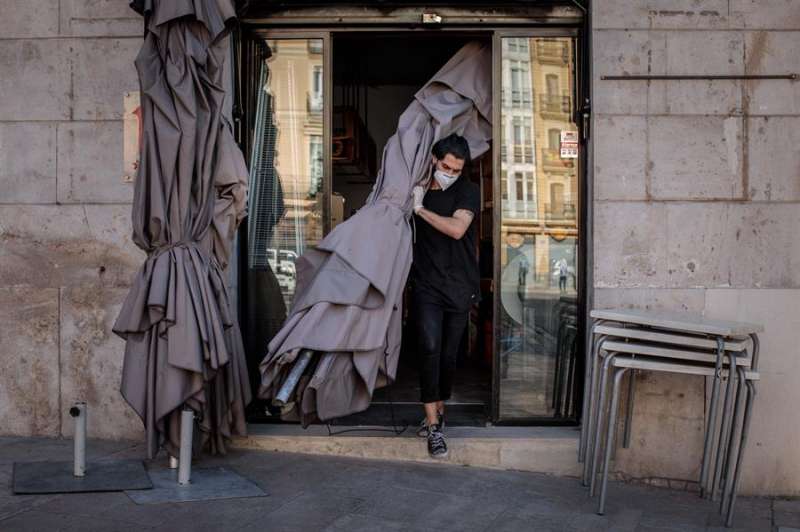 En la imagen, un trabajador monta la terraza de una cafetería en València. EFE
