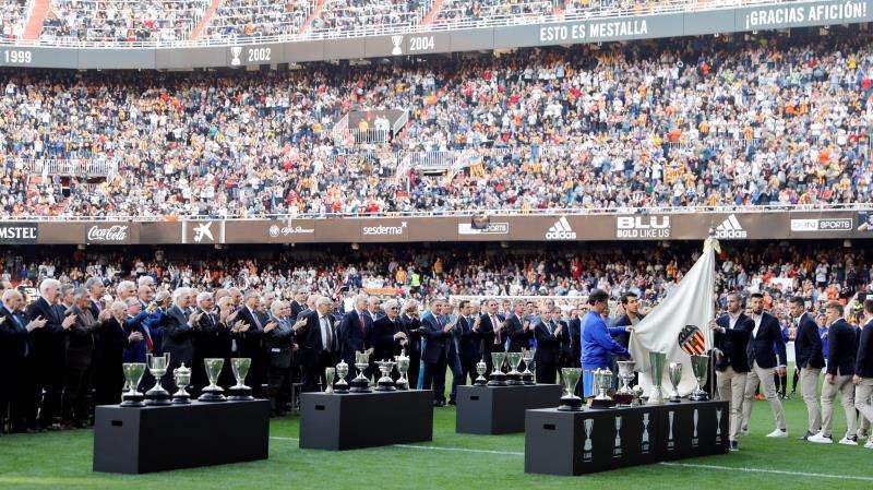 Cerca de doscientos jugadores que han llegado a vestir la camiseta del Valencia saltaron al césped de Mestalla para presentar a la afición los trofeos obtenidos por el club en su primer siglo de vida, que este domingo se celebra con un partido de leyendas del club ante las de la selección española.