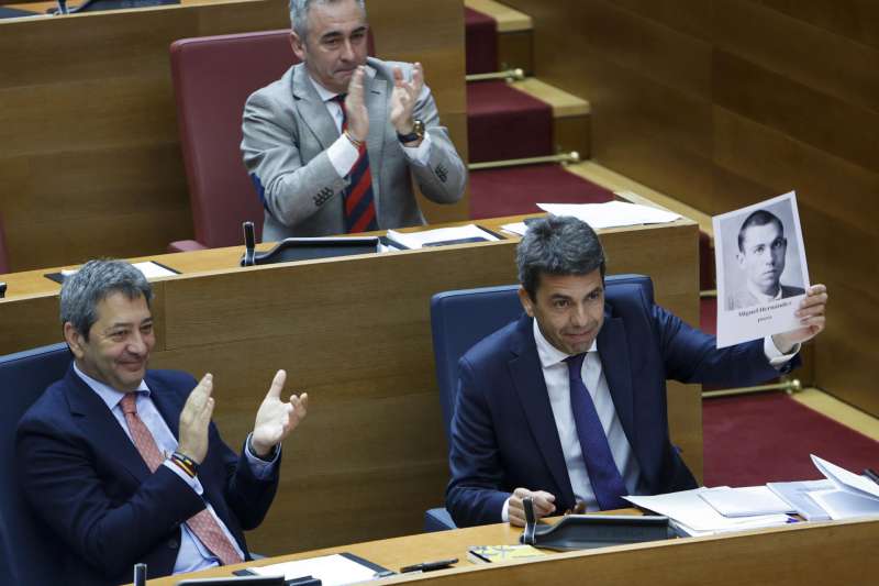 El president de la Generalitat, Carlos Mazón, muestra en Les Corts una foto del poeta Miguel Hernández. EFE/Ana Escobar