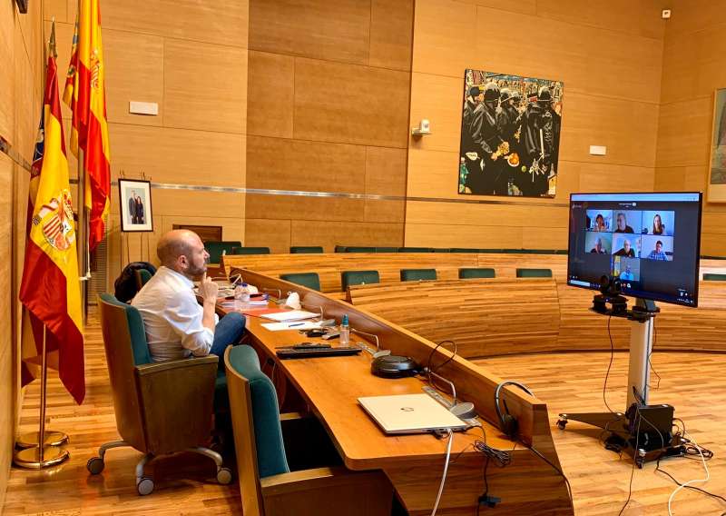 El presidente de la Diputació de Valéncia, Toni Gaspar, junto a la vicepresidenta del ente provincial y presidenta del Consorcio de Bomberos de Valencia, Maria Josep Amigó, han participado esta mañana a través de videoconferencia en la reunión del comité de crisis del Consorcio, donde los diferentes responsables del cuerpo provincial de bomberos han hecho repaso de la situación tanto de la plantilla como de las diferentes actuaciones desarrolladas a raíz del estado de alarma provocado por la pandemia de la Covid-19.