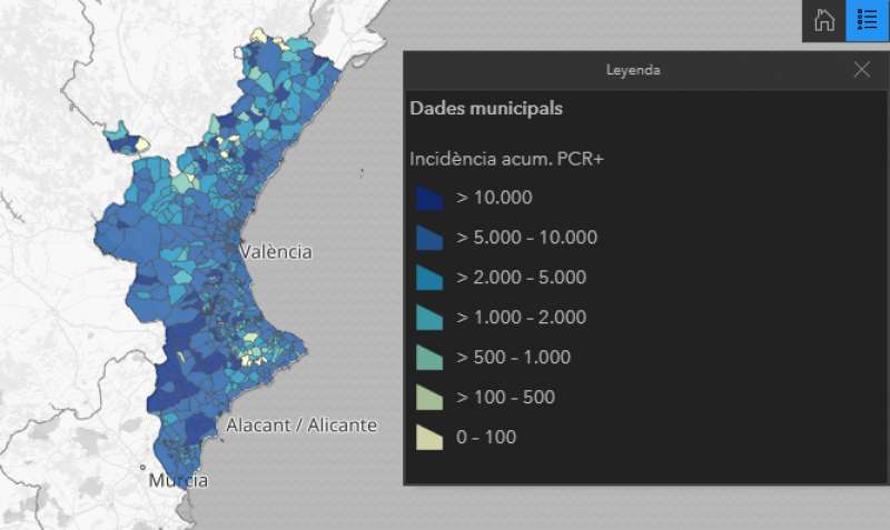 Mapa de la incidencia acumulada en la Comunitat ValencianaLa incidencia acumulada del coronavirus de la Comunitat Valenciana ya supera a la de Madrid.