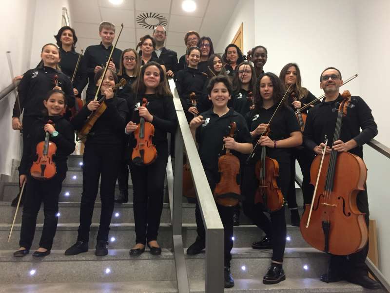 a los jóvenes estudiantes de cuerda de su Escuela de música Joaquín