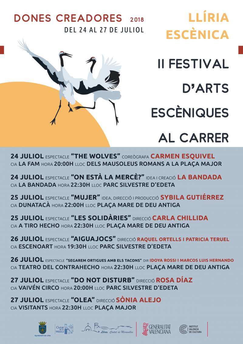 En esta segunda edición de "Llíria Escènica" actuarán las compañías La Fam con el espectáculo itinerante "The Wolves", La Bandada con "On està la Mercè?", Dunatacà con "Mujer", Atirohecho con "Les solidàries", Escenoart con "Aiguajocs", Teatro del Contrahecho con "Segarem ortigues amb els tacons", Vaivén Circo con "Don not disturb", y Visitants con "Olea".