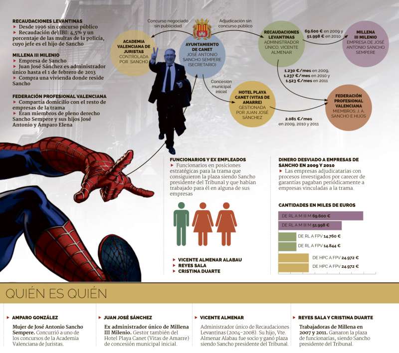 Con el gobierno del PP se ha roto con la Academia Valenciana de Juristas (AVJ) -chiringuito jurÃdico dirigido por Sancho-; y con la empresa de recaudación Recaudaciones Levantinas, que controlaba el susodicho y pagó a Millena III Milenio -otra empresa de Sancho- 69.600 euros en 2009 y 51.998 en 2010. Esta llevaba desde los años 90 cobrando impuestos, como IBI y multas con un contrato a dedo hasta que el PP sacó este servicio a licitación.