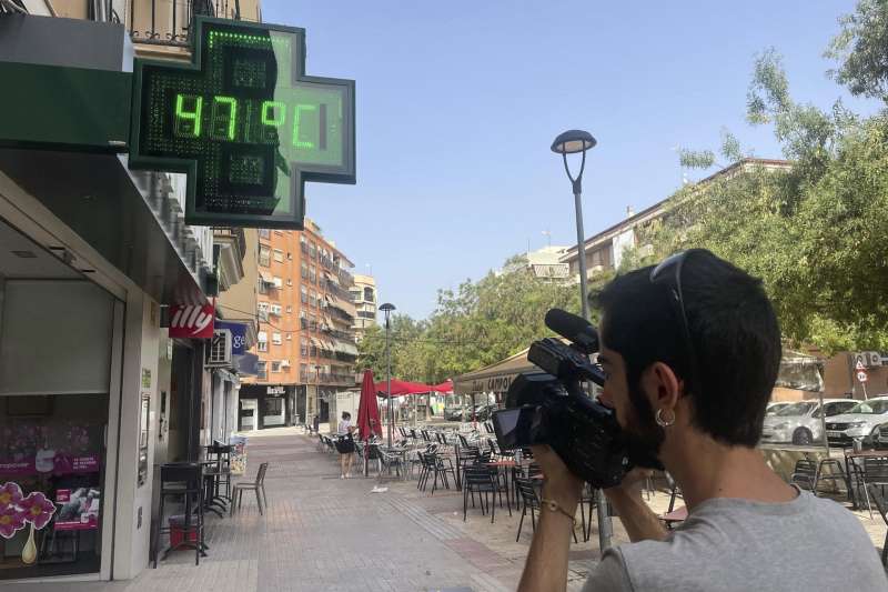 En la imagen un cámara graba un termómetro urbano en Xàtiva. EFE/Raquel SeguraLa tercera ola de calor del verano bate récords históricos en la Comunitat Valenciana con valores generalizados cercanos a los 40 grados en las tres provincias y con puntos, incluso, por encima de los 45.