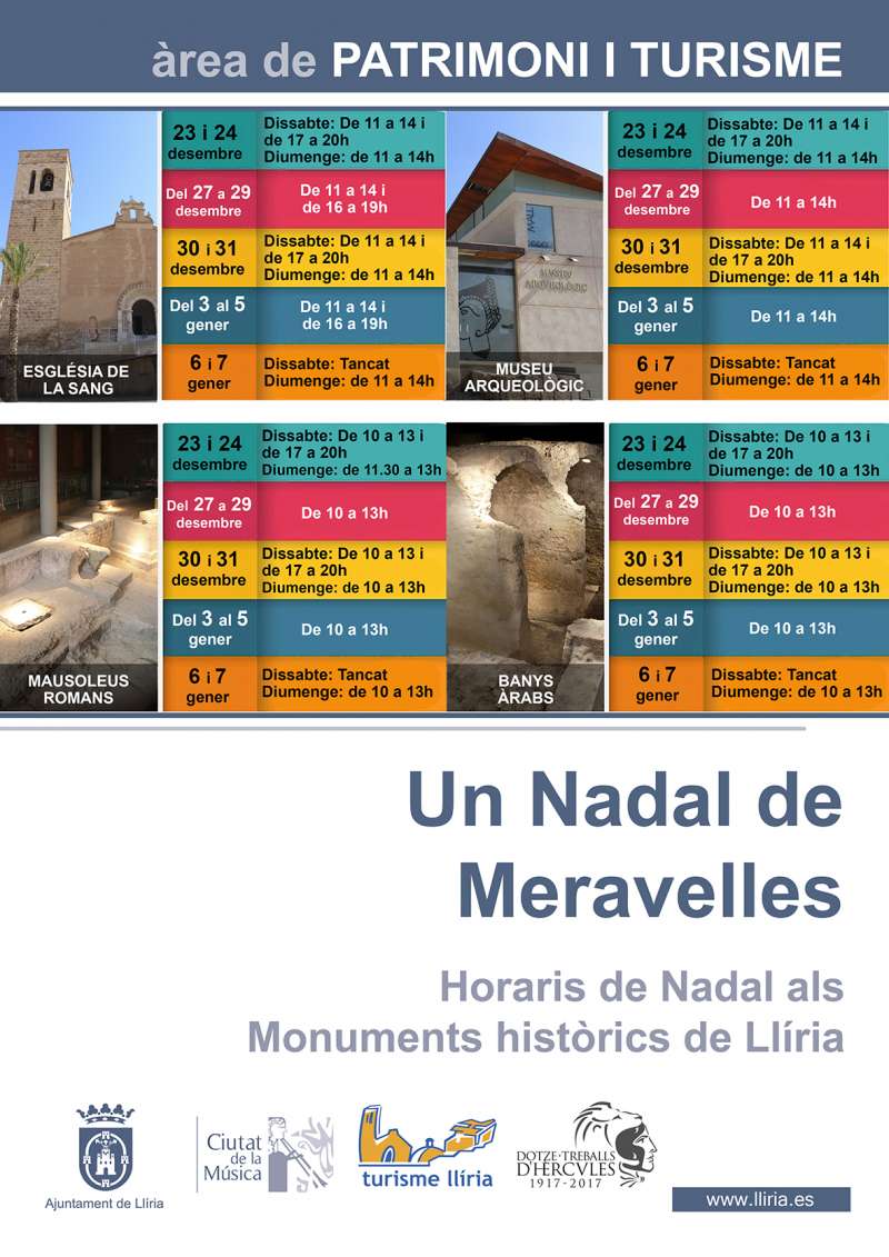 A través de la campaña "Un Nadal de Meravelles", la concejalía de Patrimonio Histórico y Turismo tiene el objetivo de aprovechar las fiestas navideñas, como periodo tradicional de ocio familiar, para animar a visitar toda la diversidad de monumentos, museos y lugares históricos de Llíria.