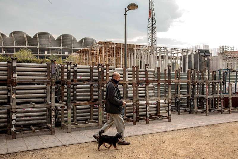 Una persona pasea a su perro frente a unas obras en València. EFE