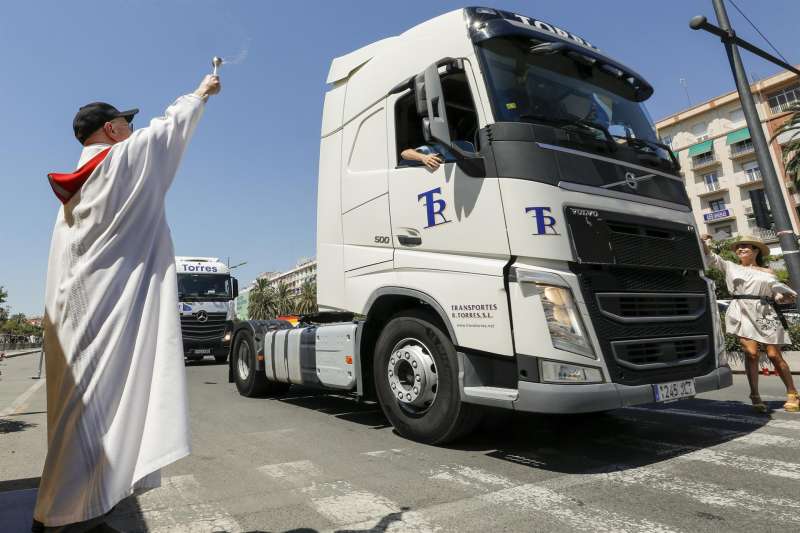 Un sacerdote bendice a uno de las decenas de camiones que se han concentrado en el puerto de València.EFE/ Juan Carlos CárdenasLos transportistas valencianos han celebrado este sábado el día de su patrón, San Cristóbal, con una cabalgata desde la sede de la federación hasta el puerto de València en la que han reivindicado la importancia del sector como esencial y han recordado las dificultades por las que atraviesan por la escalada de costes.