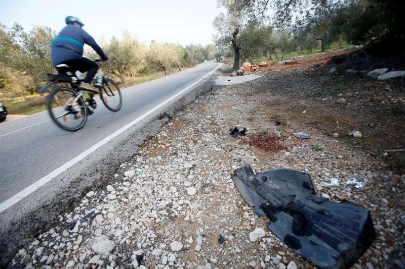 Un ciclista pasa por el punto donde un grupo de ciclistas sufrieron un accidente. EFE/Manuel Lorenzo/Archivo