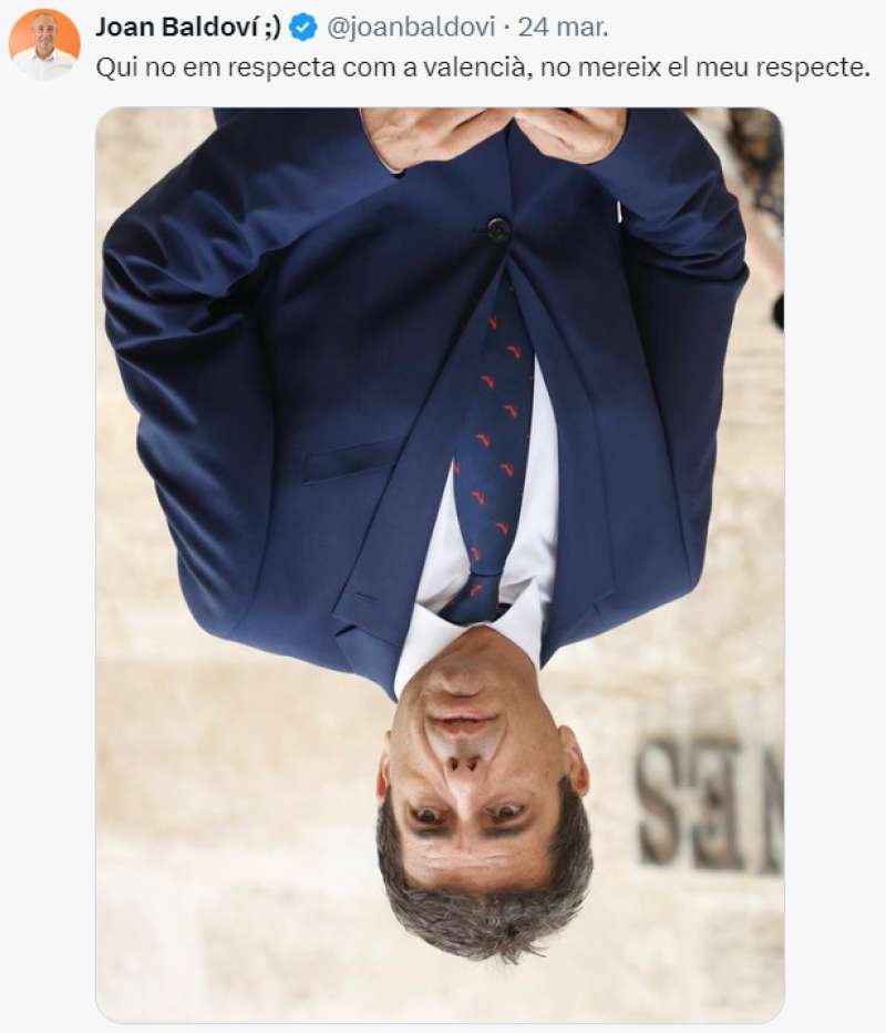 Tuit de Joan Baldoví. /EPDABaldoví ha colgado en sus redes sociales una fotografía de Mazón al revés. Como si fuese Felipe V o un Cinco Jotas. Entendería que, vista del revés, la sonrisa del cambio se vería más triste. Pero, para tristeza de Baldoví, el cambio se queda.