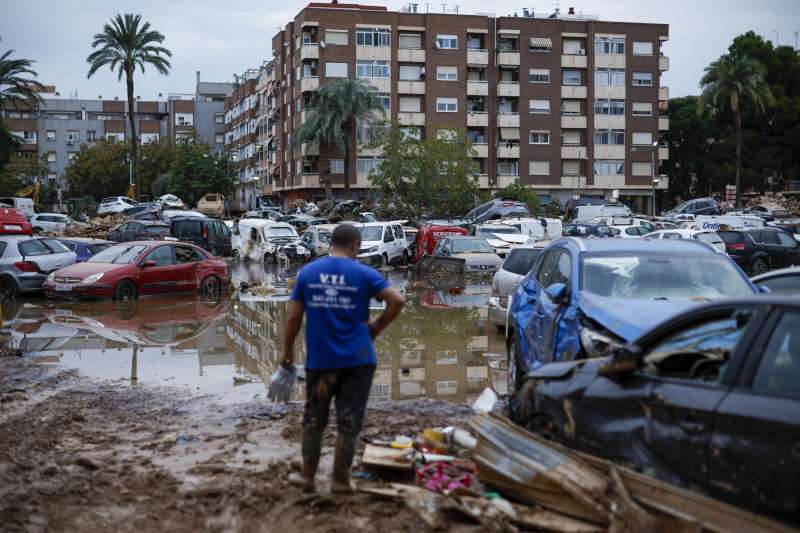 Un hombre junto a varios coches arrastrados por el agua tras el paso de la dana, en Paiporta. EFE/ Biel Aliño