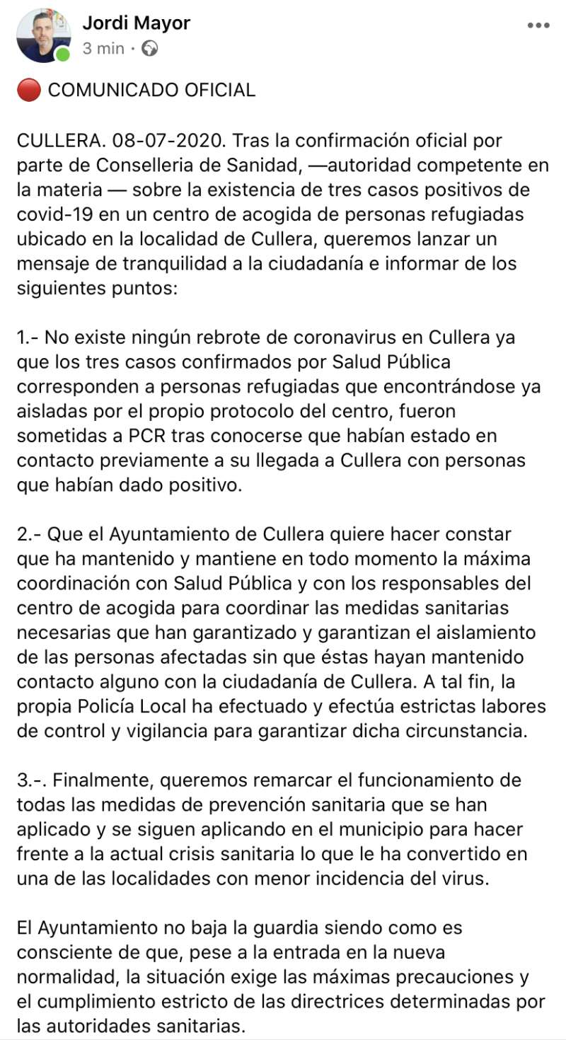 Tres personas refugiadas en un centro de acogida de Cullera dan positivo por coronavirus. El alcalde Jordi Mayor lanza un mensaje de tranquilidad a la población a través de su cuenta de Facebook: