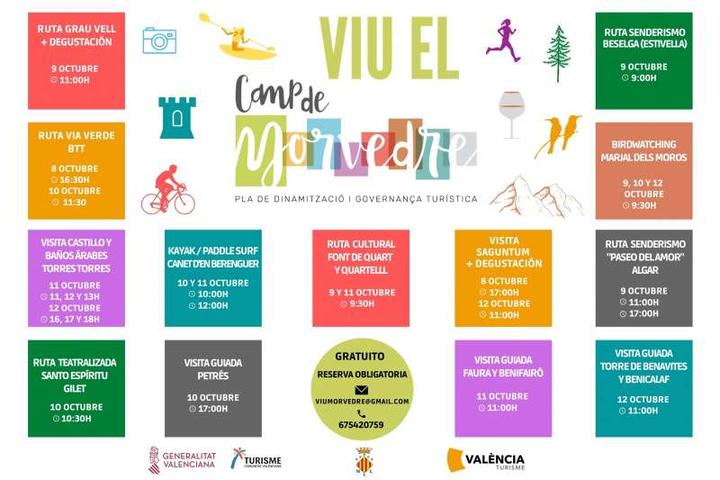 Desde la Delegación de Turismo del Ayuntamiento de Sagunto, la cual gestiona este Plan de Dinamización, han preparado un puente de octubre lleno de actividades, visitas guiadas, actividades náuticas, degustaciones, rutas en bicicleta, senderismo y rutas culturales para dar a conocer, a todo tipo de visitantes, el patrimonio cultural y natural de La Baronía, Les Valls, Sagunto y Canet d’en Berenguer, es decir, los municipios que engloba el Camp de Morvedre.