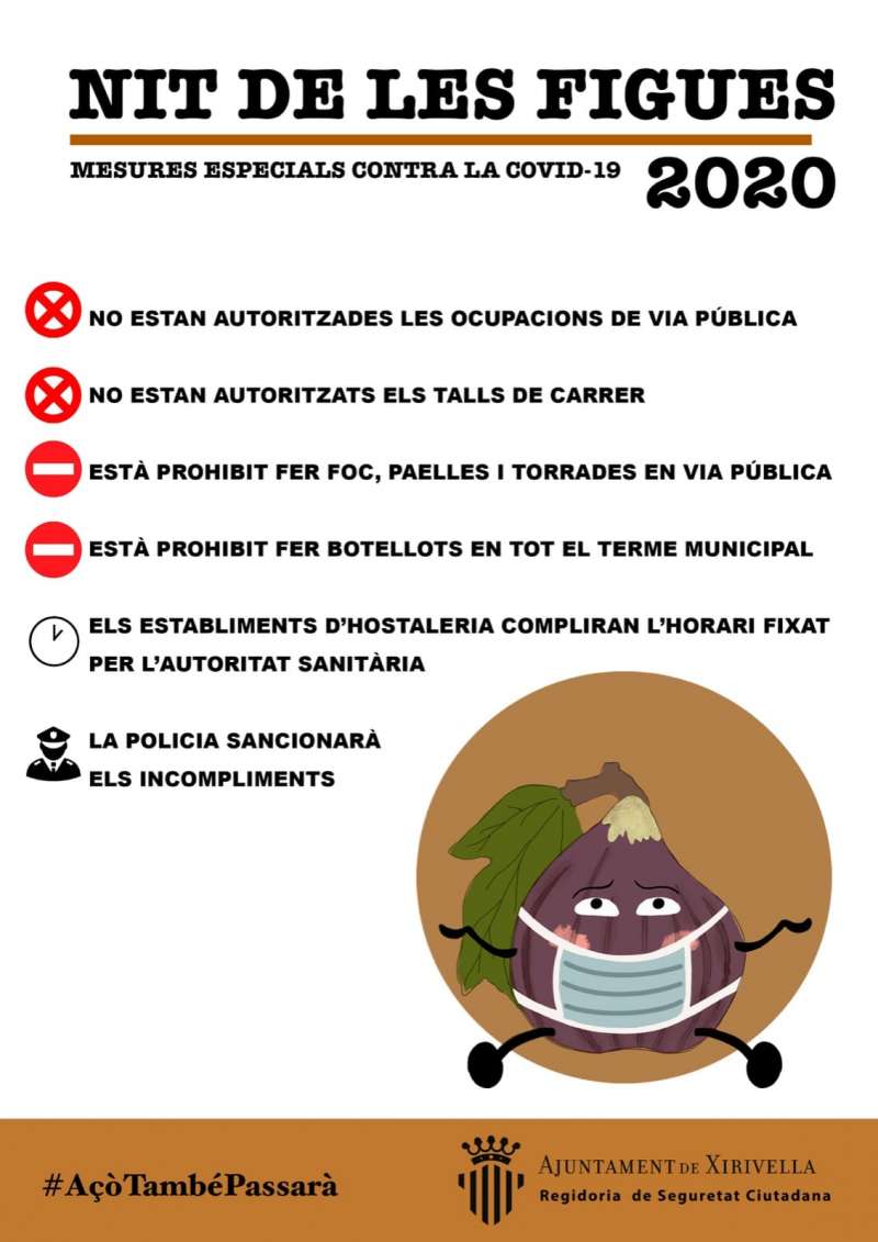 “Estas medidas van dirigidas a todo el mundo: jóvenes, mayores, familias y pandillas de amigos”, advierte Sandoval. “La policía tiene órdenes claras de sancionar los incumplimientos”, zanja el concejal responsable de la seguridad. Las restricciones habilitadas para la Nit de les Figues coinciden, además, con la entrada en vigor de la prórroga de todas las medidas especiales que la Conselleria de Sanitat puso en marcha tres semanas atrás; entre otras, el cierre del ocio nocturno, la prohibición de fumar en espacios abiertos sin distancia de dos metros o las limitaciones de horario y aforo para los negocios de hostelería.