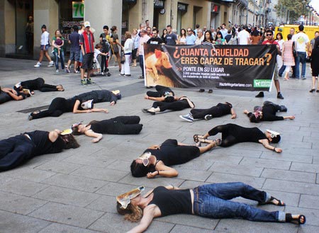AnimaNaturalis se pone en la piel de los animales de granja para denunciar su maltrato en varias ciudades españolas, entre ellas Valencia