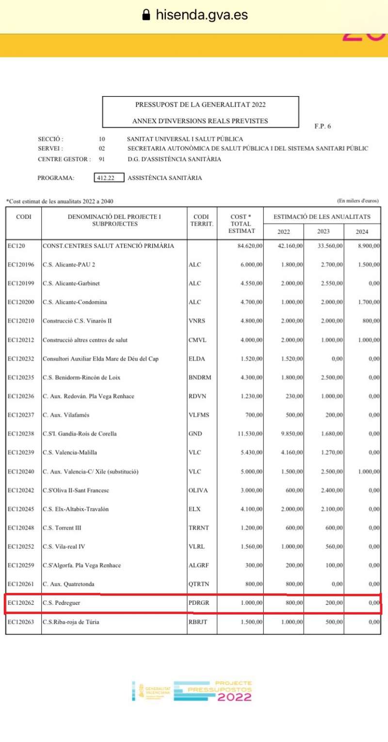 Així, el projecte de pressupostos de la Generalitat Valenciana de 2022 inclou una partida econòmica per iniciar les obres del Centre de Salut de Pedreguer. Concretament, es pressuposten 800.000 euros per a 2022, i per a 2023 una previsió de 200.000 euros